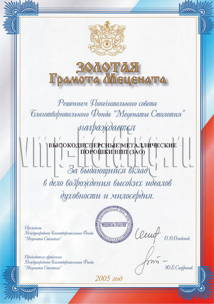 Золотая грамота Мецената «За выдающийся вклад в дело возрождения высоких идеалов духовности и милосердия», 2005 г.