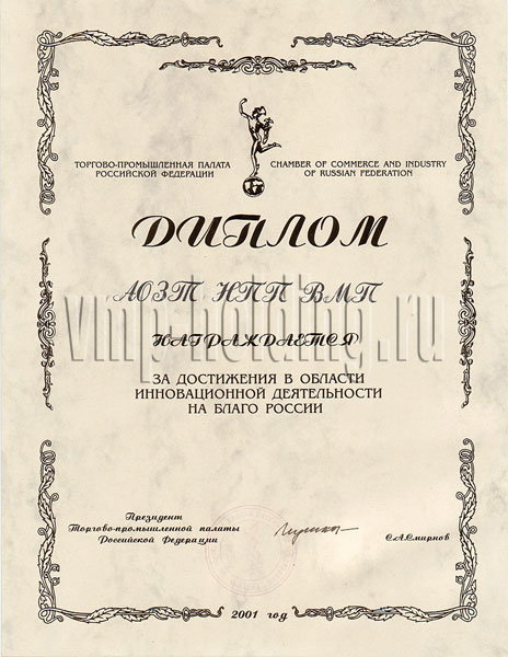 Диплом Торгово- промышленной палаты России «За достижения в области инновационной деятельности на благо России», 2001г.