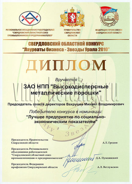 Призовая статуэтка и диплом лауреата в номинации «Лучшее предприятие по социально-экономическим показателям» конкурса «Лауреаты бизнеса – звезды Урала-2010».