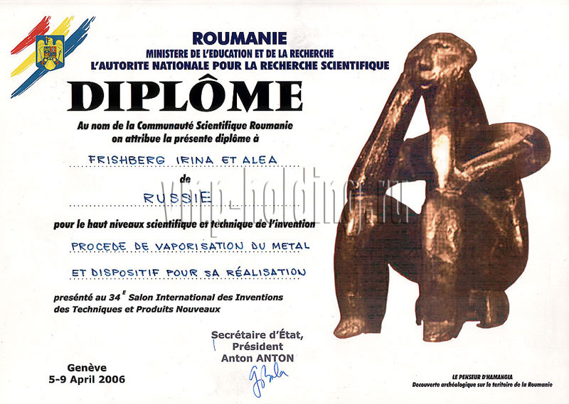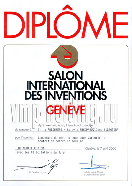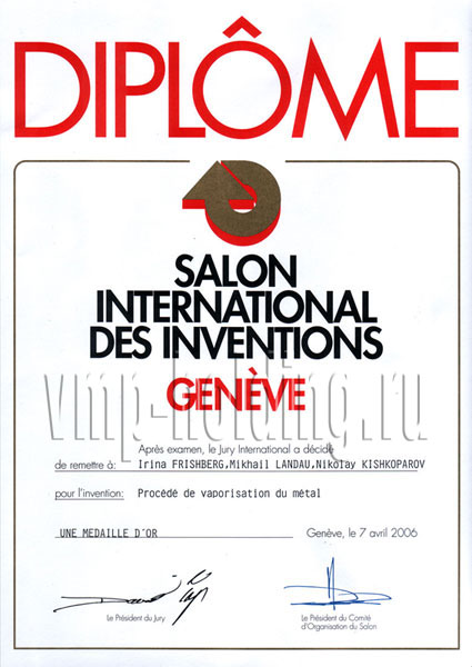 Специальный приз Гран-при и две золотые медали Международного салона изобретений, новой техники и товаров «Женева-2006» за способы получения высоко– и нанодисперсных металлических порошков и продукцию на их основе.