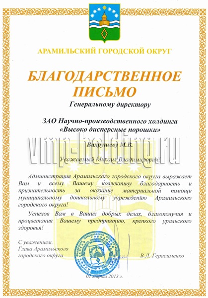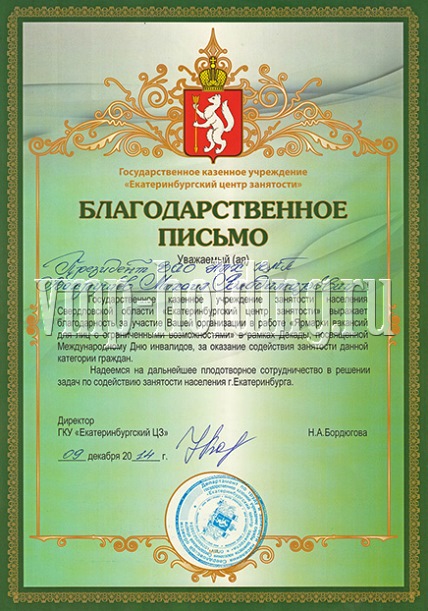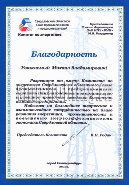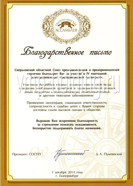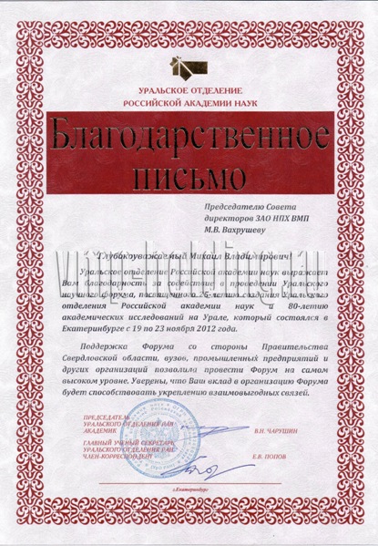 Благодарственные письма: «За содействие в проведении Уральского научного форума, посвященного 25-летию создания Уральского отделения российской академии наук и 80-летию академических исследований на Урале», «За организацию и успешное проведение заседания Комитета по энергетике Свердловского областного союза промышленников и предпринимателей», «За оказание материальной помощи муниципальному дошкольному учреждению Арамильского городского округа», «За вклад в оказание необходимой врачебной и медикаментозной помощи юным пациентам с онкологическими, гематологическими и другими тяжелыми заболеваниями», «За участие в работе Ярмарки вакансий для лиц с ограниченными возможностями в рамках Декады, посвященной Международному Дню инвалидов, за оказание содействия занятости данной категории граждан».
