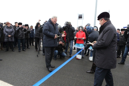 На фото: губернаторы Томской области и Ханты-Мансийского автономного округа торжественно открывают мост. Фото с сайта tomsk.gov.ru